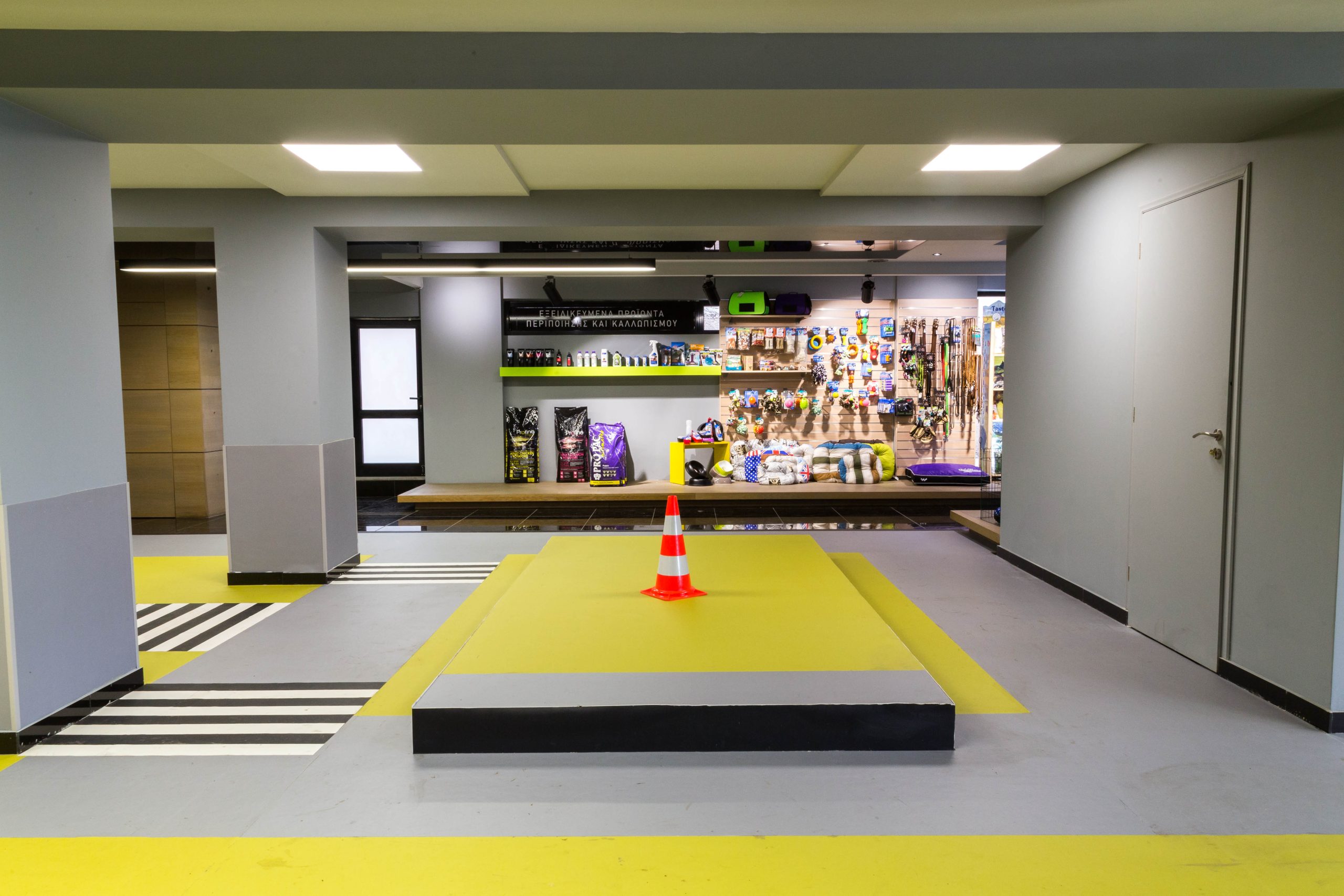 Ο στίβος εκπαίδευσης αποτελεί προσομοίωση πάρκου κυκλοφοριακής αγωγής σκύλων και ανθρώπων.